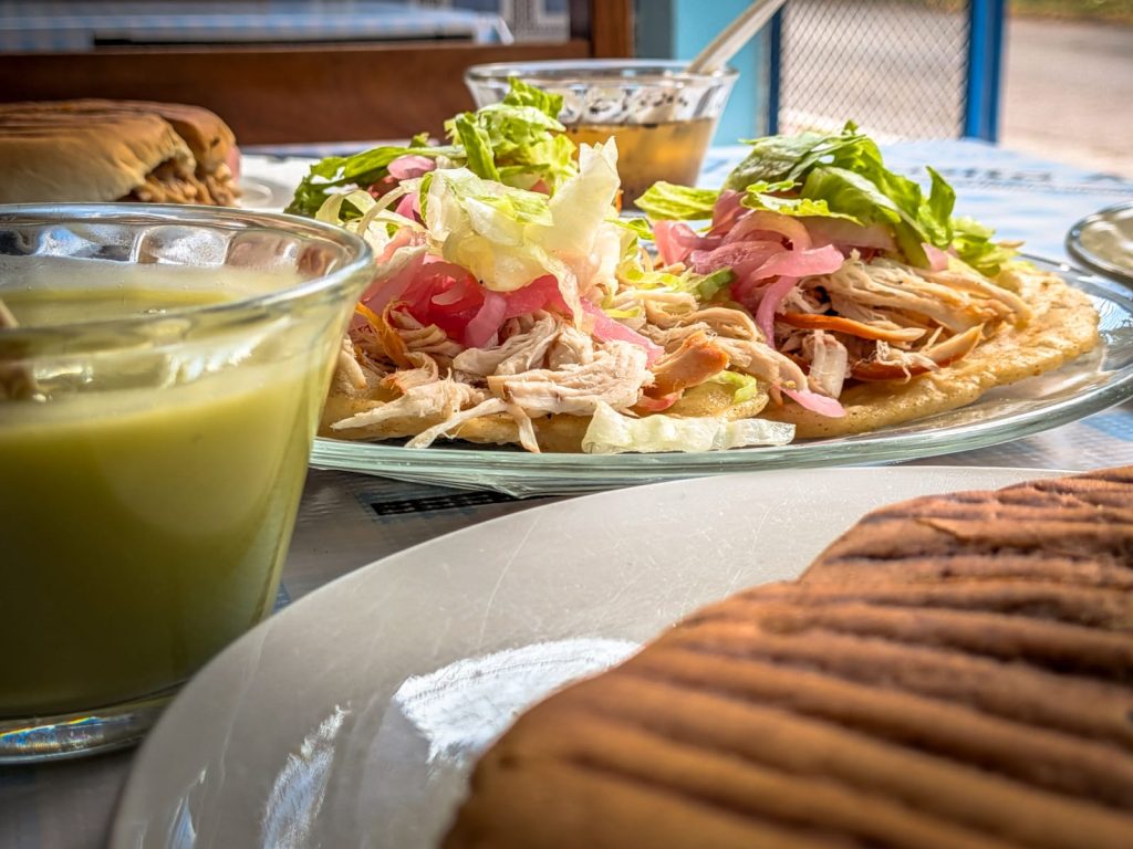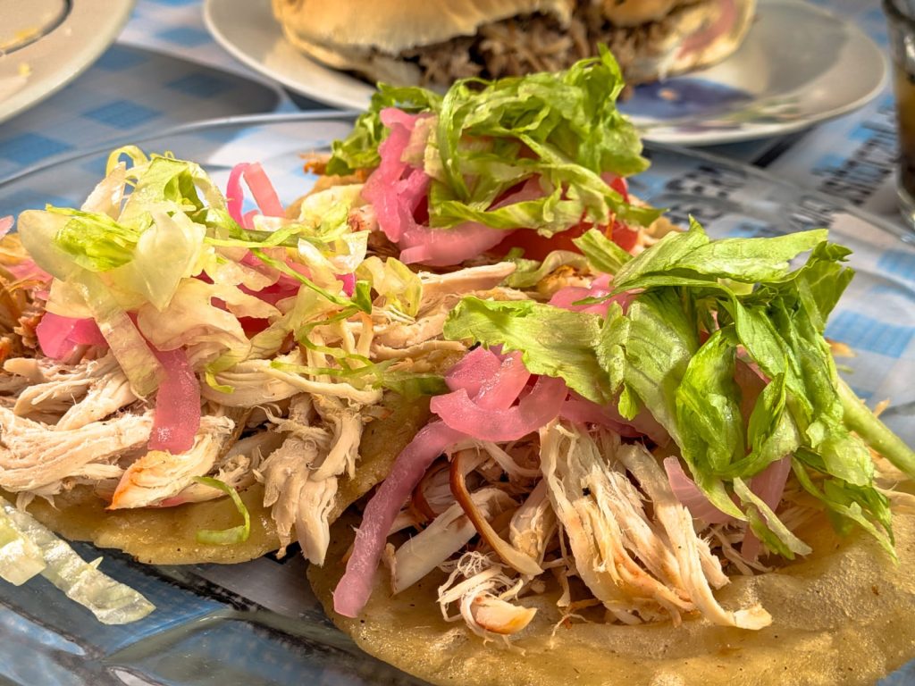 Tortilla De Maíz frita rellena de Pollo, bañados con Salsa de Tomate, Media Crema y Queso de Bola Gallo Azul.