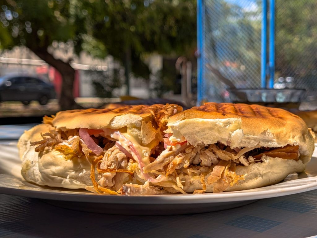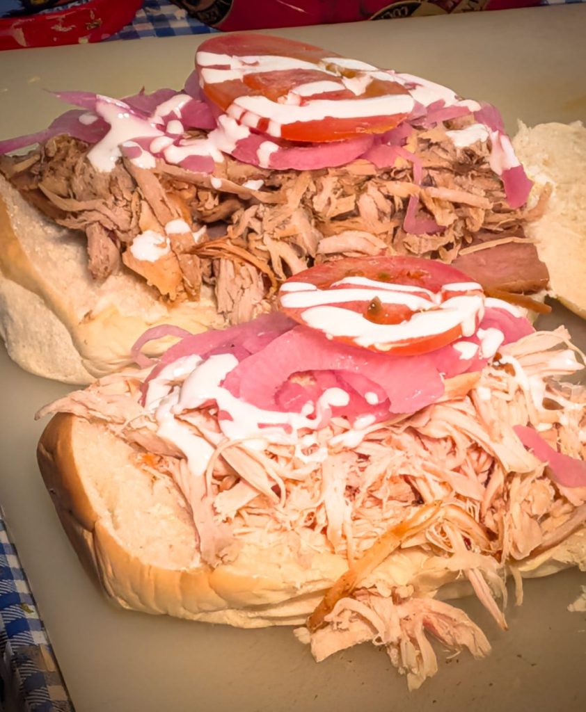 Pierna de Cerdo Claveteada, Mayonesa, Mantequilla,Cebolla, Tomate, Media Crema y Queso De Bola.