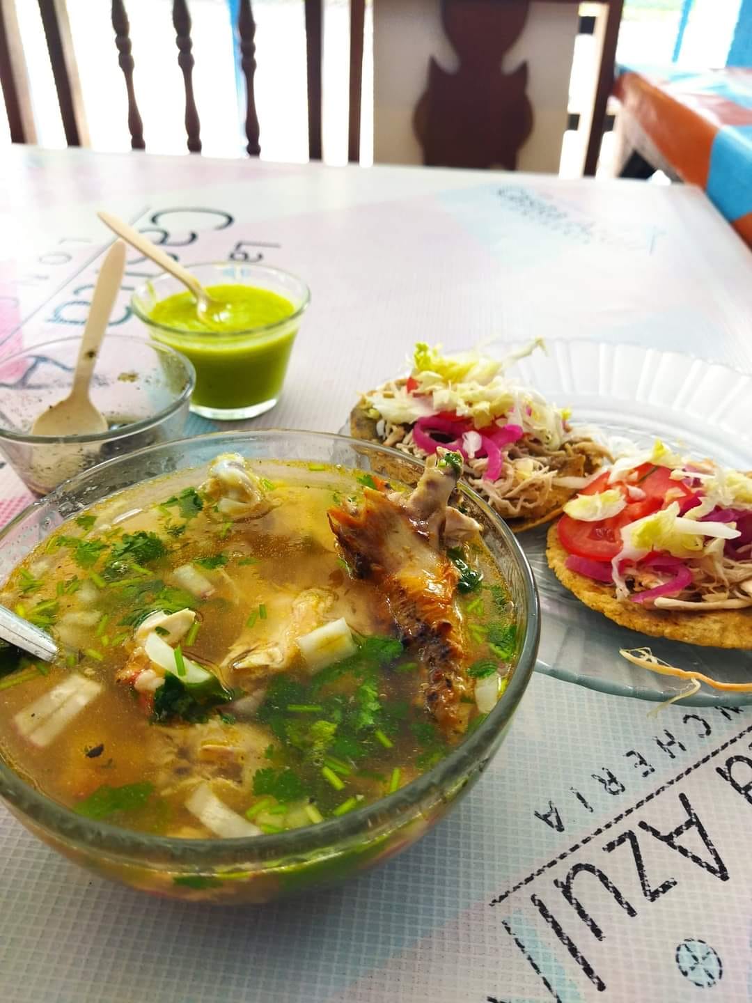 Pechuga de Pollo desmenuzado, Cebolla, Tomate, Romanita y Queso de Bola gallo azul.